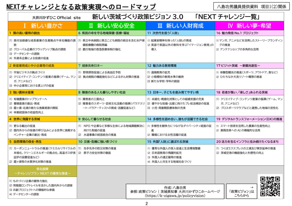 その上で、県政の最重要課題である人口減少対策と、3期目の政策ビジョン「新しい茨城づくり政策ビジョン3.0」に掲げられた20項目の「ネクストチャレンジ」の具体化について質しました。