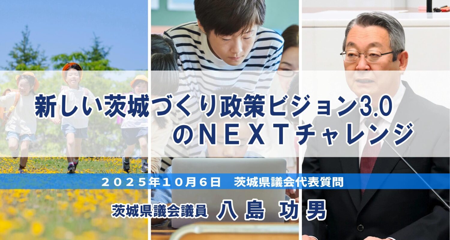 2025年10月6日に行われた茨城県議会代表質問で、県議会公明党の八島功男議員が登壇し、3期目の当選を果たした大井川和彦知事に対し祝意を述べました。