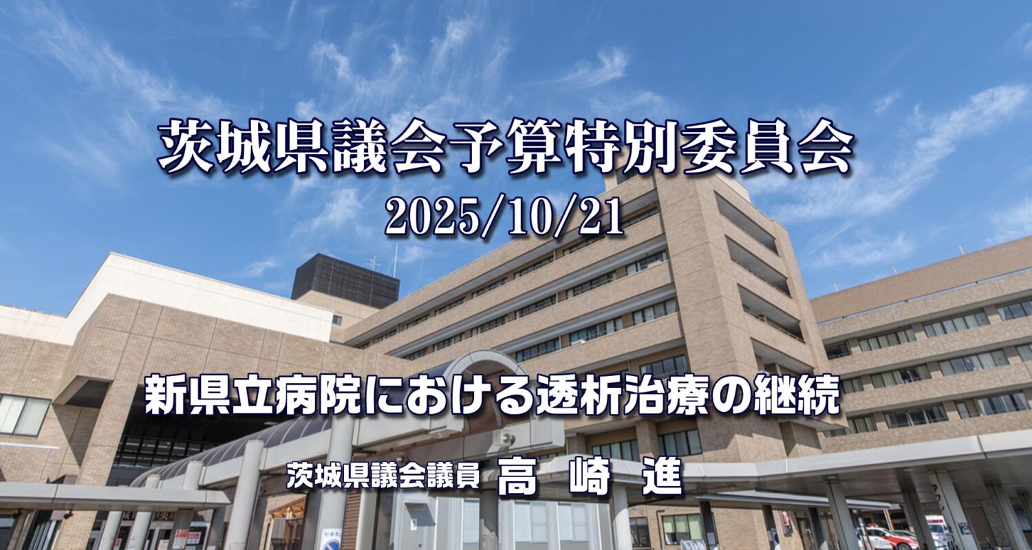 10月21日、茨城県議会の予算特別委員会で、公明党の高崎進議員が「新県立中央病院における透析治療の継続」を求めました。