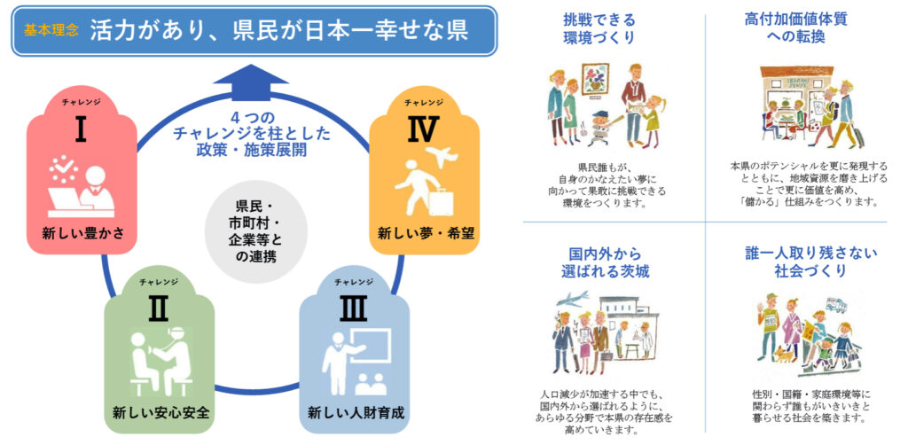 新しい計画は、激動する国際情勢や加速する人口減少など、変化の激しい時代にあっても、県民一人ひとりが希望を持ち、「茨城に住みたい、住み続けたい」と思える県づくりを目指して策定されるものです。基本理念には、現行計画から引き続き「活力があり、県民が日本一幸せな県」の実現が掲げられました。その理念を実現するための柱として、「新しい豊かさ」「新しい安心安全」「新しい人財育成」「新しい夢・希望」という4つの分野でのチャレンジを進めていく方針が示されています。