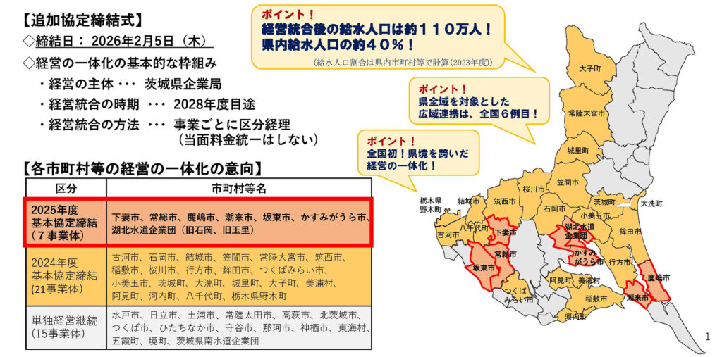 今回の協定により、令和6年度に先行して締結していた21市町村に加え、新たに下妻市、常総市、鹿嶋市、潮来市、坂東市、かすみがうら市、湖北水道企業団の7事業体が参画しました。これにより、県企業局と連携して経営統合を進めるのは合計28市町村等となり、統合後の給水人口は約110万人と県内全体の約4割を占める規模になります。これは、県全域を対象とした広域連携としては全国でも先進的な事例であり、県境を跨いだ経営の一体化としても注目を集めています。