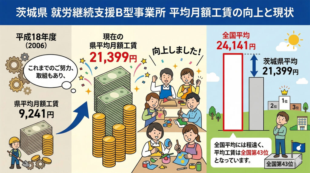 2006年度の県平均月額工賃は9,241円でしたが、県のこれまでのご努力、取組もあり、平均月額工賃は2万1,399円まで向上しました。 しかし、全国平均の2万4,141円には程遠く、平均工賃は全国第43位となっています。