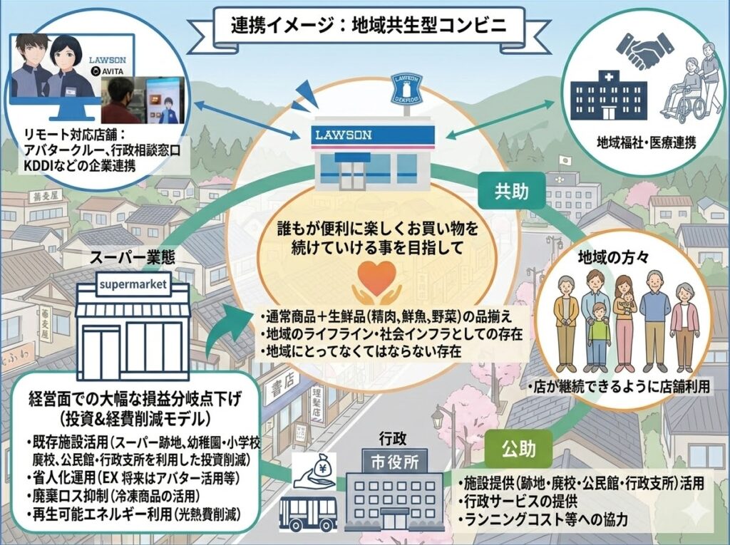 提案された「地域共生型コンビニ」は、食料品の販売はもちろんのこと、ATMや公的証明書の発行、さらには行政相談や医療・介護へのアクセス拠点としての機能を備えたものです。店員さんが「対面のインターフェース」として寄り添うことで、デジタルに不慣れな高齢者も安心してサービスを受けられる、温かみのある場所を目指しています。また、地域の雇用創出や災害時の防災拠点としての役割も期待されています。